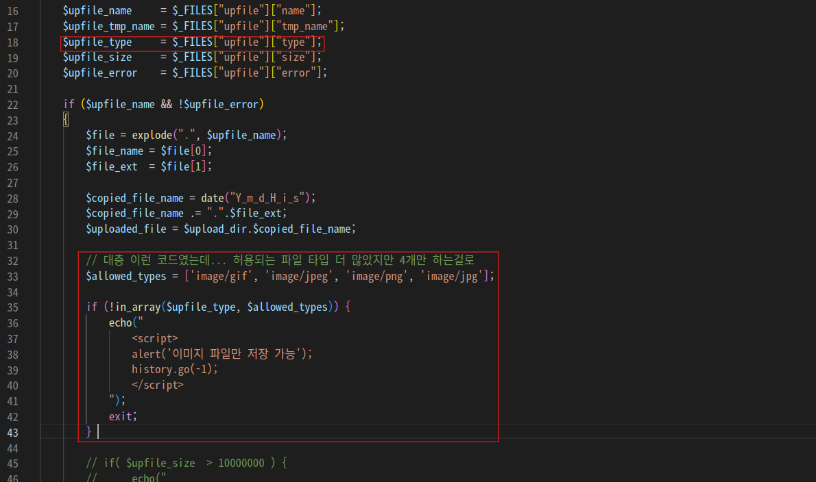 나는 “문제에 주어진 코드가 단순하게 파일 타입만 검증하고 있으니 웹 프록시 툴을 이용하여 클라이언트 측에서 변조 가능한 부분(확장자 변조 .php.img로 하는 방법 등)을 활용하여 우회할 수 있다.”라는 식으로 썼었다…