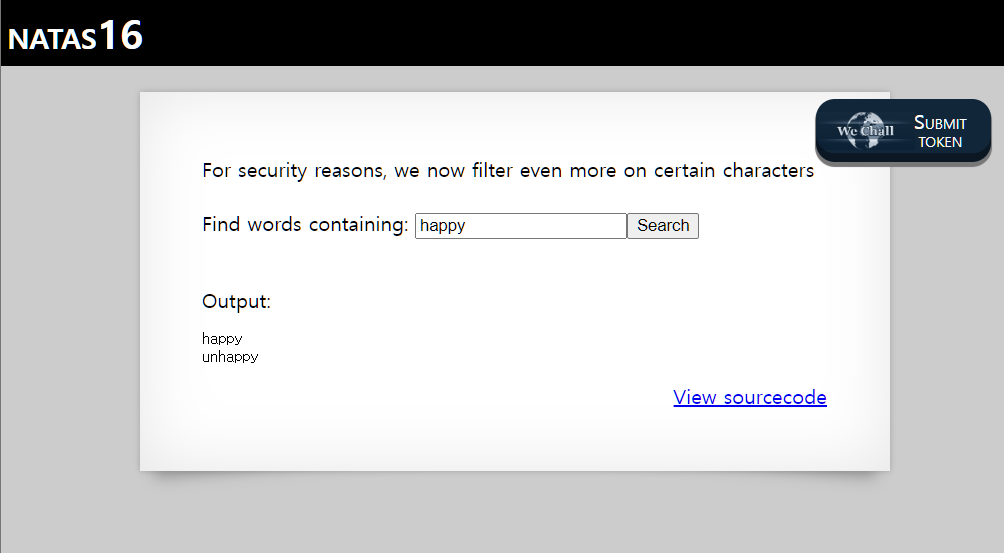 natas17 패스워드 문자열에 a가 없어서 happy를 입력했을 때와 같은 화면이 뜨는 것이다.
