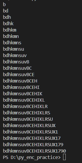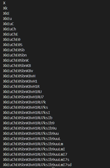 이제 출력된 문자열 bdhkmnsuvBCEHIKLRSUX1790을 하나씩 넣어서 패스워드를 조합하는 프로그램을 쓰자.