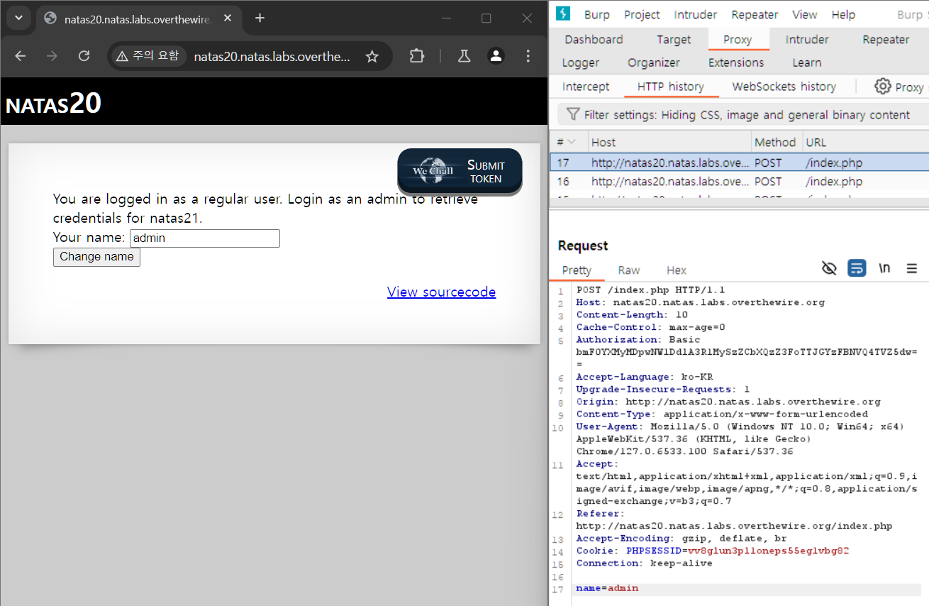 name을 바꾸는 요청을 인터셉트해서, 세션 파일에 admin 1 키-값이 추가되도록 name 파라미터에 admin 1을 url인코딩한 값으로 바꿔 보내자.